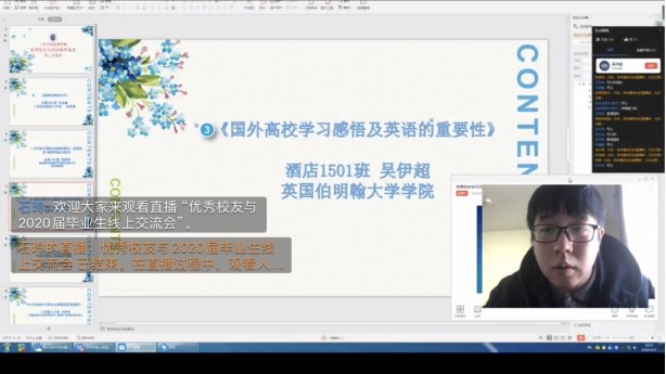 临近毕业,学院领导和老师十分重视毕业生的就业问题,由衷希望2020届毕业生能够顺利就业,我院诚挚地邀请现就读于英国伯明翰大学的15级校友吴伊超与应届毕业生进行线上交流,思想导师石玲和部分16级学生参加此次线上交流会。