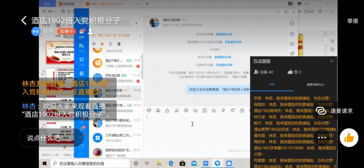 接着,我班在线上举行了入党推优大会活动,每位竞选者都用心准备,认真演讲,让班级的其他同学看到了他们精彩表现的同时,也看到了他们入党的决心。最后本次大会我们班的五名同学都通过竞选,成为了一名光荣的积极分子。