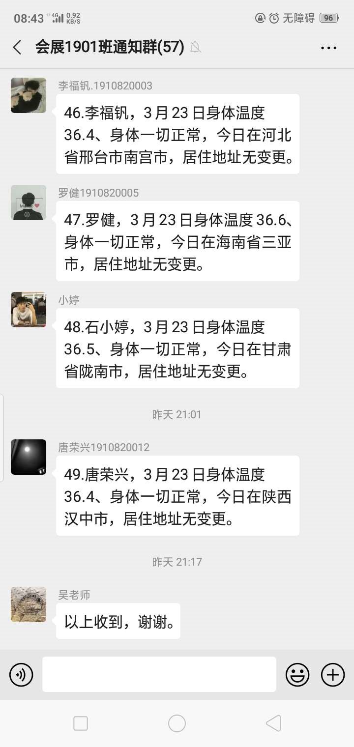 疫情期间,导员每天在班级群里收集同学们的主要活动区域、体温状况以及有无出现发热咳嗽现象,在收集同学们身体状况的同时,每天都会要求同学们进行健康码的填写,以便于学校能够制定开学日期、同学们能够顺利返校。