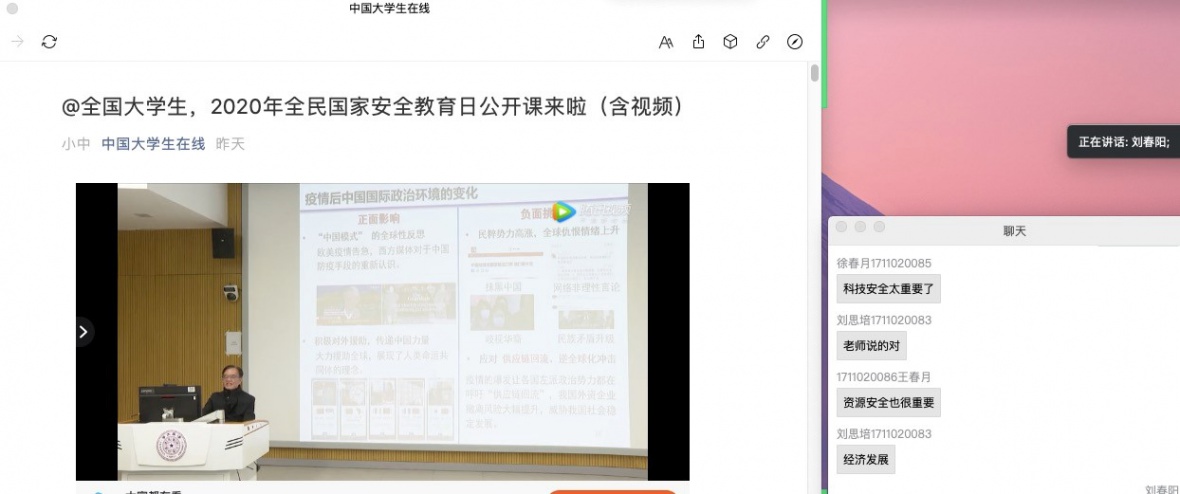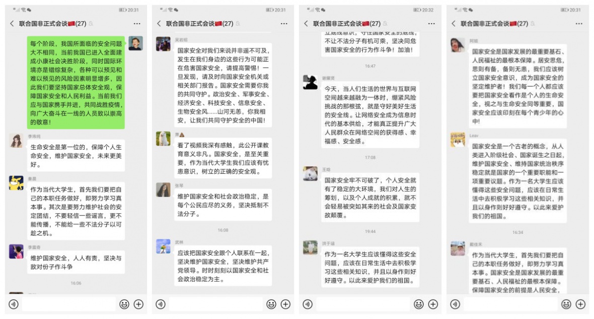 我院全体学生通过多种形式学习这堂国家安全教育课,同学们通过学习后受益匪浅,并组织参与了观后感讨论及参与线上知识竞赛答题。通过学习与讨论,同学们充分有关国家安全的知识,认识到国家安全的重要性,并清晰明白自己的责任与担当。
