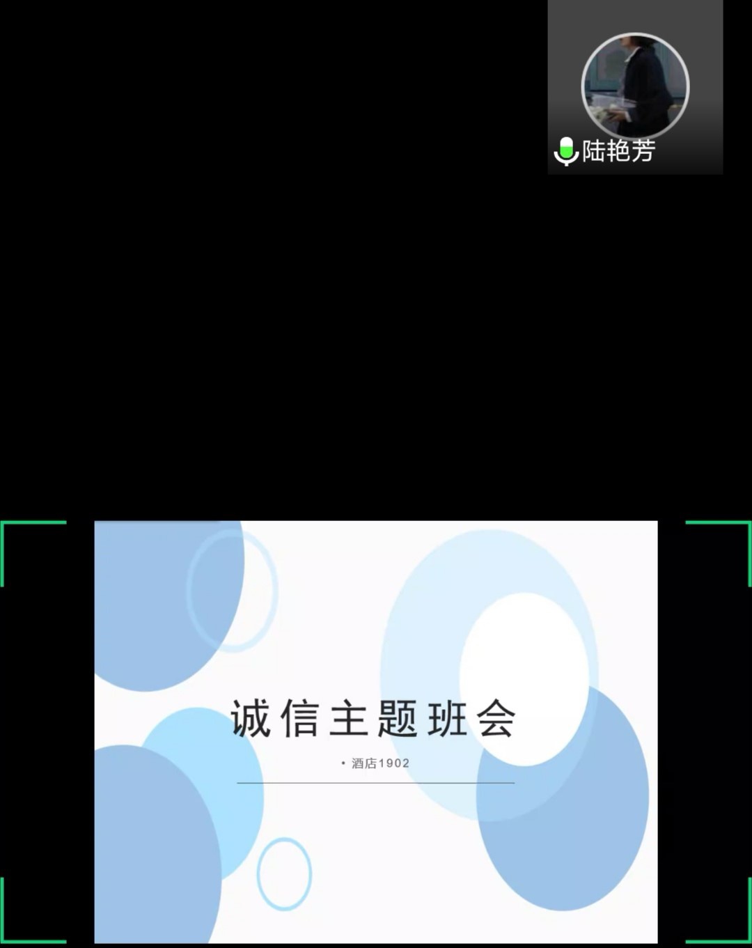 六月我院不仅有丰富多彩的校园活动,亦是我院的诚信活动教育月。为积极响应诚信教育活动,酒店1902班举办了线上班会。本次班会,同学们了解到诚信的内涵,认识到诚信的基本要求;引导同学们践约守信,诚实做人;增强同学们的责任感,帮助同学们树立正确的道德观念,大力弘扬了中华诚实守信的传统美德。