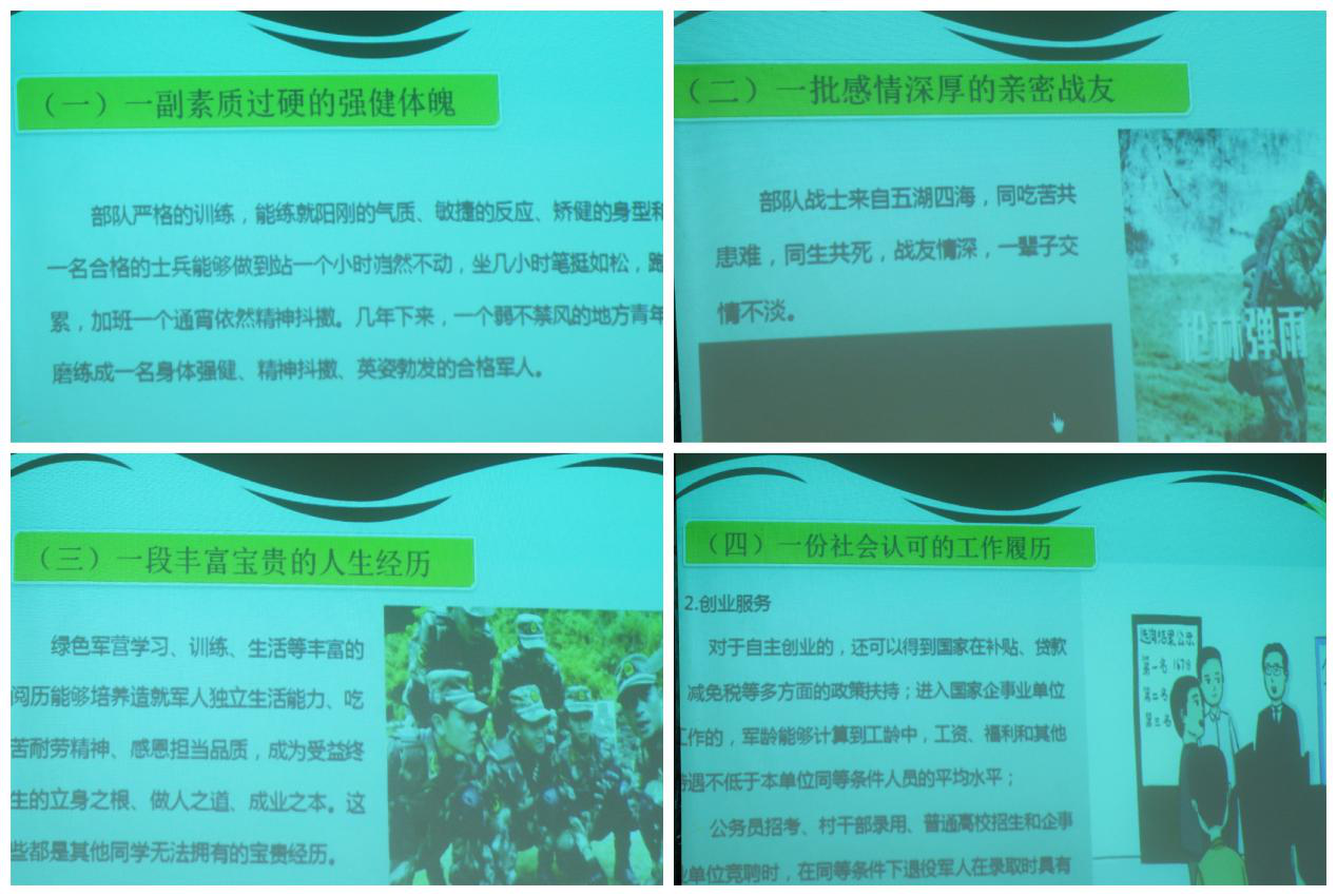 通过今天的讲座,为学生们提供了一个新的就业选择,使学生们了解到一份职业和平台对于今后职业生涯的重要性。学生们需要规划好自己的人生,当兵的学生归来身披荣耀,不当兵的学生认真对待就业和工作,找到适合自己的平台,走好自己的人身道路。