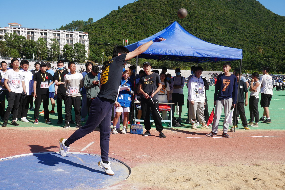 我院学生组男生铅球决赛参赛选手在赛场上推球