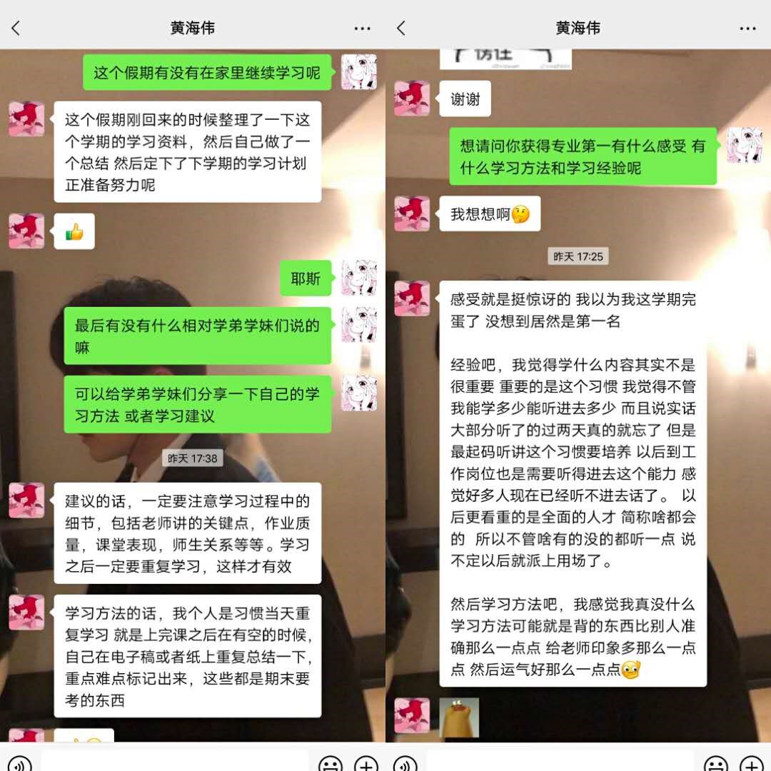 山水一程,笔墨为舟。会展经济与管理专业2001班的张传鑫表示取得第一的好成绩,不仅依赖于自身的坚持与努力,还应该感谢老师们的言传身教。高中与大学学习的不同之处在于大学的生活不仅拓展了我们的思维方式,还丰富了我们的精神世界,这是高中生活所不能给予的。他认为,我们要坚持习近平总书记提出的终身学习观念,从小层面上来说,是为了自身的美好幸福;在大局上,是为了中国社会的美好幸福。在采访中,张传鑫为我们介绍了他在大学四年的学习之旅中的基本规划,在大一时光中要打好坚实的专业基础,提高交际、合作能力,在大二时考取证书证明自己的知识技能;在大三大四的时间里,他志愿考取研究生,去探索更多有关知识的精彩。