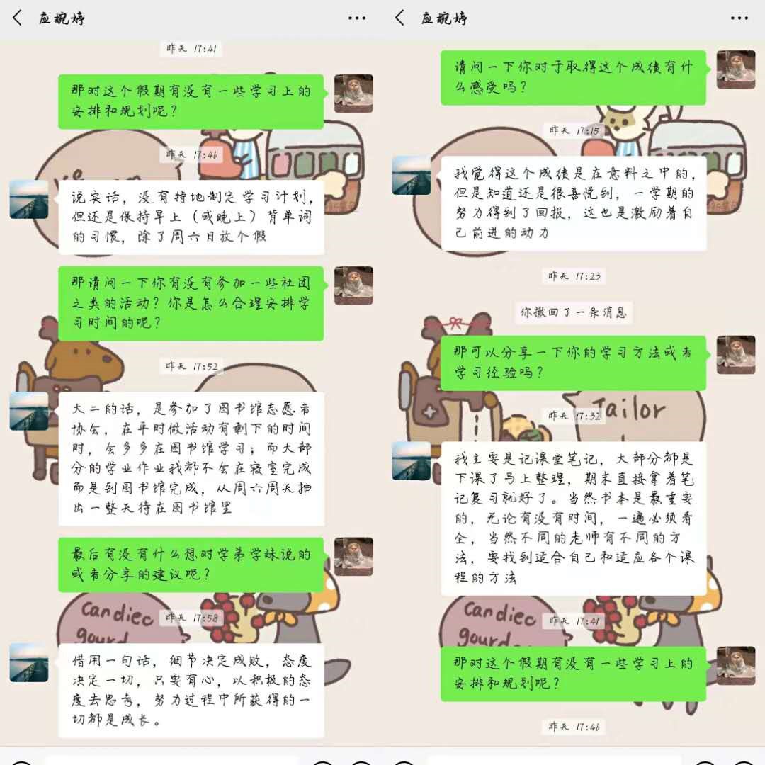 只要功夫深,铁杵磨成针。会展经济与管理专业2001班的占琪表示取得这样的好成绩,这不仅没有辜负老师们的辛勤付出和栽培,也是肯定自己大一上学期的努力。占琪介绍到,自己的学习方法就是专注和坚持,专注是指在每一节课上的认真听讲的,学习老师看待问题的思维方式,这是学习中最重要的一部分;其次可以针对每门科目准备一本笔记本,记录课堂上老师讲的重点、难点,以提高日后的复习效率。她还告诉我们她一般会利用早晚自习时间进行学习,持之以恒便可以养成良好的学习习惯。占琪在假期时会在网络上寻找与专业相关的视频以及英语电影来了解自己的专业和提升英语能力,充分的利用自己的空余时间丰富自己的知识。