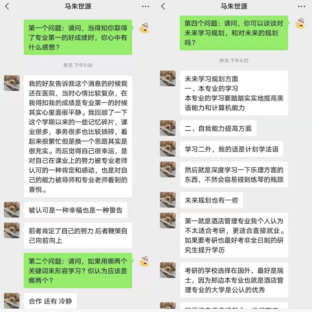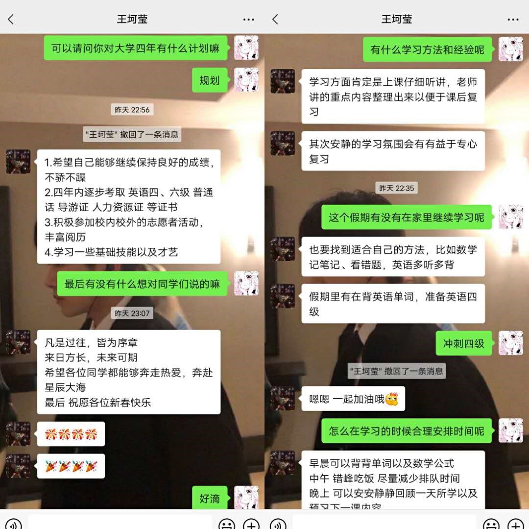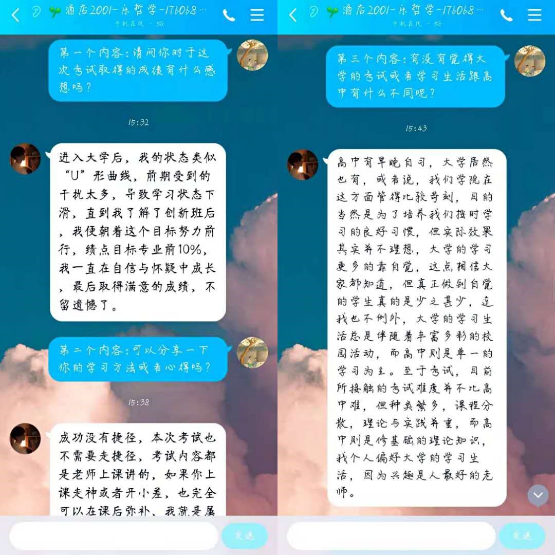 功夫不负有心人,星光不问赶路人。在采访中,旅游管理专业2002班的王珂莹表示在此次期末考试中能获得专业第一感到非常荣幸,并感谢专业课程老师们的辛勤付出和悉心教导。王珂莹提到在学校的生活是紧张而忙碌的,她深刻地认识到时间是海绵里的水,利用短暂的早读时间来背英语单词和数学公式,利用错峰用餐的方式以减少午餐时间,在宁静的夜晚回顾白天所学的内容。在采访中,王珂莹提到了大学未来四年的规划,希望自己能够继续保持良好的成绩,在四年内逐步考取英语四、六级,普通话等证书,积极参加校内校外的志愿者活动,丰富阅历,并表示成绩只能代表过去,未来还要看个人的目标和决心,以后会严格要求自己,以一颗平常心,踏实勤奋,才能取得更优异的成绩,才能创造更美好的未来。