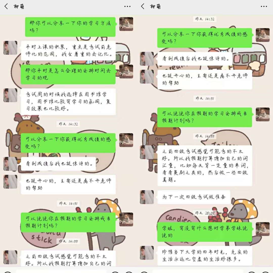 厚积而薄发。会展经济与管理专业1901班的学生柳萌表示取得好成绩离不开平时的积累和老师地帮助,最后要利用好考试周,以笔记和课程重点进行复习。在日常的学习中,她建议学生选择在图书馆进行学习,图书馆良好的氛围能使人静下心来学习。在这个假期中,每天坚持背一定量的单词,看英剧,做四级真题,增加词汇量,为下一次的英语四级考试做好准备。希望在英语四级考试中取得一个优异的成绩。她希望大一的学生们“珍惜当下的时光,充实的生活永远比空虚的生活好很多。”