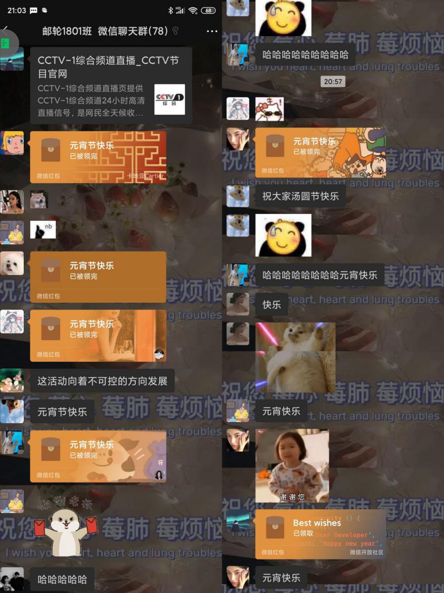 会议的最后,班长兰宇昂进行了会议总结和节日祝福,本次线上元宵节主题班会在学生们的欢声笑语中落下了帷幕。然而元宵佳节氛围浓厚,学生们意犹未尽地在班级聊天群里进行了节日祝福语的接龙和红包接龙,圆满甜糯的节日气息充满了整个班级群。