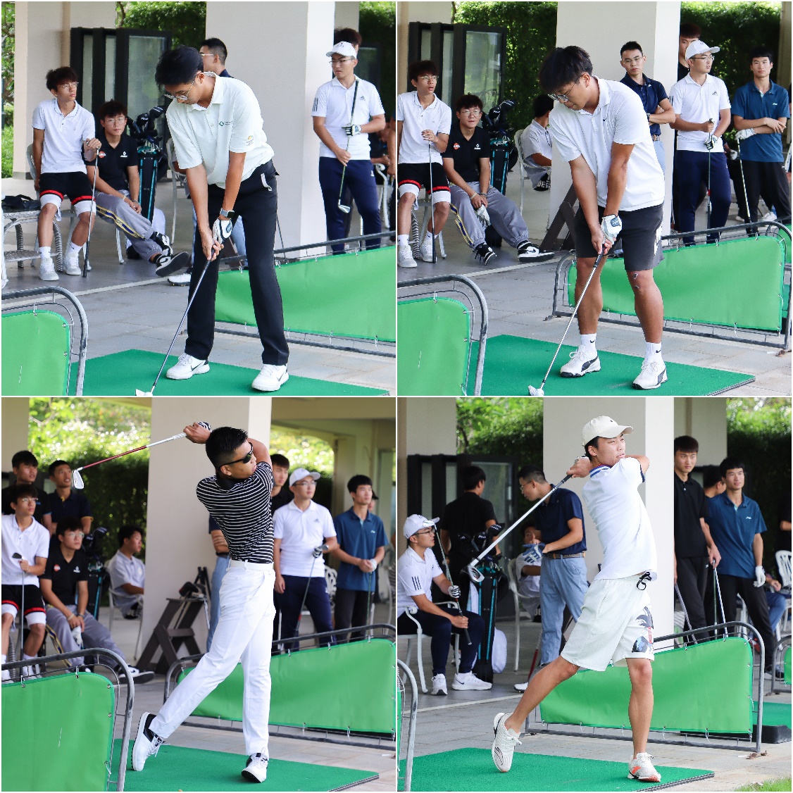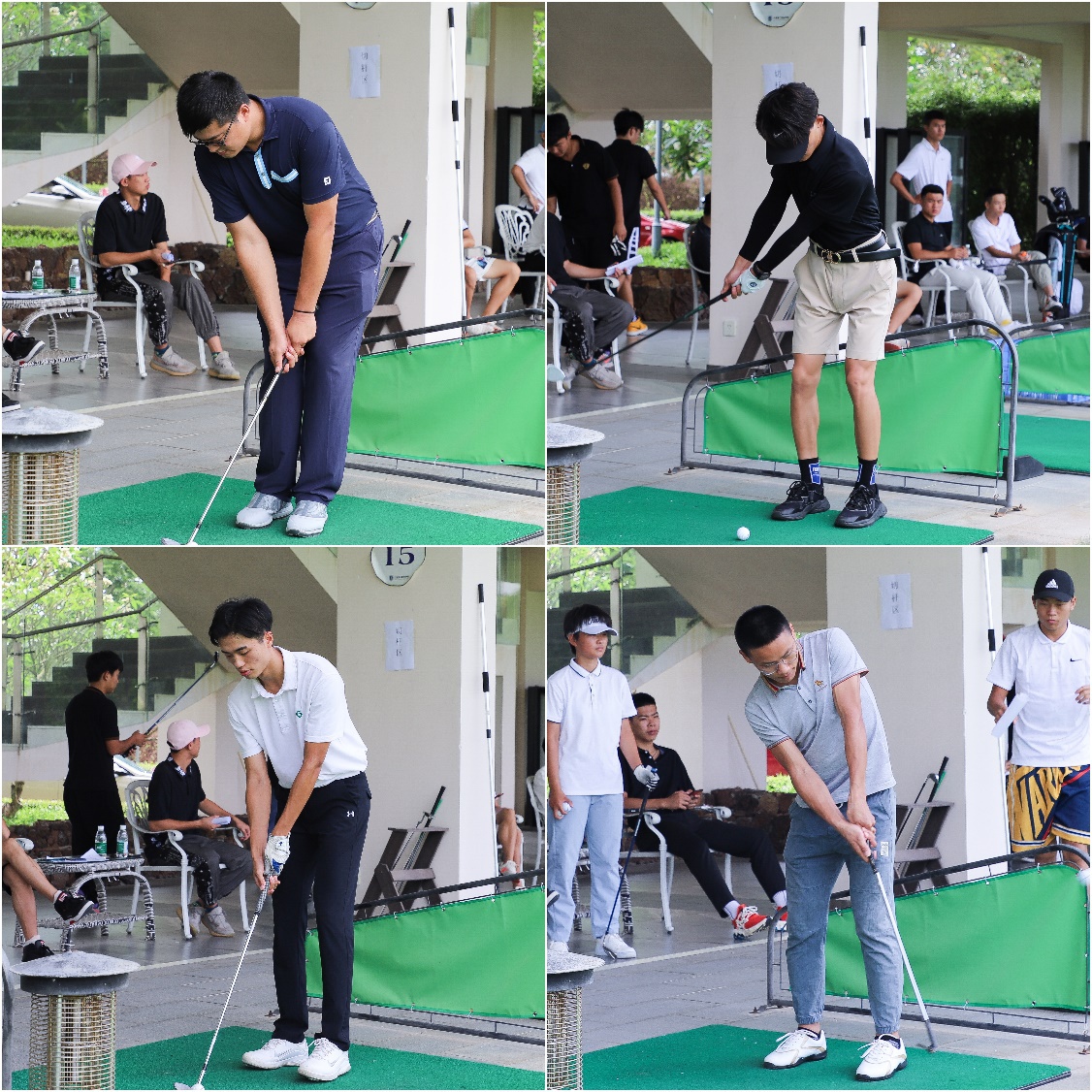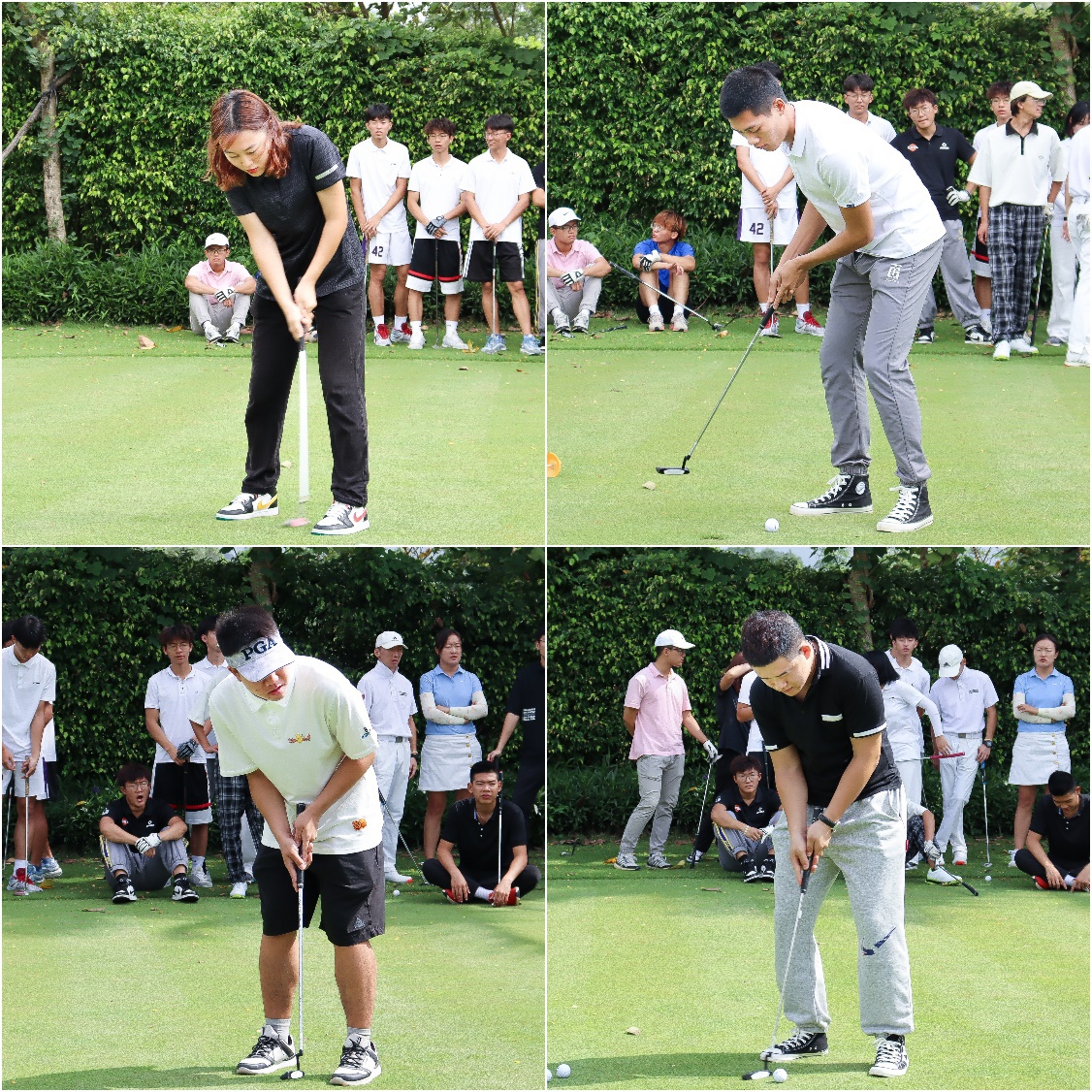 比赛伊始,由裁判长赵达老师宣读裁判守则并带领学生开球,随着彩球的开出,高尔夫挑战赛的角逐正式开始。首先进行的是“7号铁杆距离挑战赛”和“推杆挑战赛”。“7号铁杆距离挑战赛”指在规定的打位至多五分钟内击打三个球,计分方式为“码数+球路”,而“推杆挑战赛”则是设立4个球洞,学生从初始点打球,所用杆数最少者获胜。这两场比赛均为学生组挑战赛,学生们调整好自己最完美的挥杆姿势,打出一个个漂亮的直球。接着进行“短杆挑战赛”,学生们需得将球打进在固定范围15YD处的接球网内,每人5球,进入球网得10分,此场比赛也是学生组的挑战赛。在这三场比赛中,高尔夫专业学生把高尔夫球是一项具有特殊魅力的运动这一特点表现得淋漓尽致,他们以球会友,畅想挥杆乐趣。