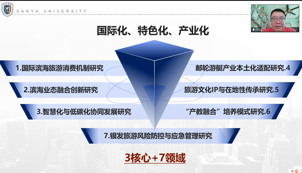 亓元教授在主题发言中系统阐述了七个重点研究方向,为团队科研工作提供战略指引,包括国际滨海旅游消费机制研究、业态融合与创新机制、智慧化与低碳化协同、邮轮游艇产业本土化适配、旅游文化IP与在地性传承、产教融合培养模式创新以及银发旅游风险防控与应急体系。亓元教授特别指出,嵌入式旅游与城市治理研究应当紧扣“国际化、特色化、产业化”三大核心,充分发挥三亚作为滨海旅游城市的资源优势,注重理论与实践相结合,推动科研成果转化为城市治理效能。