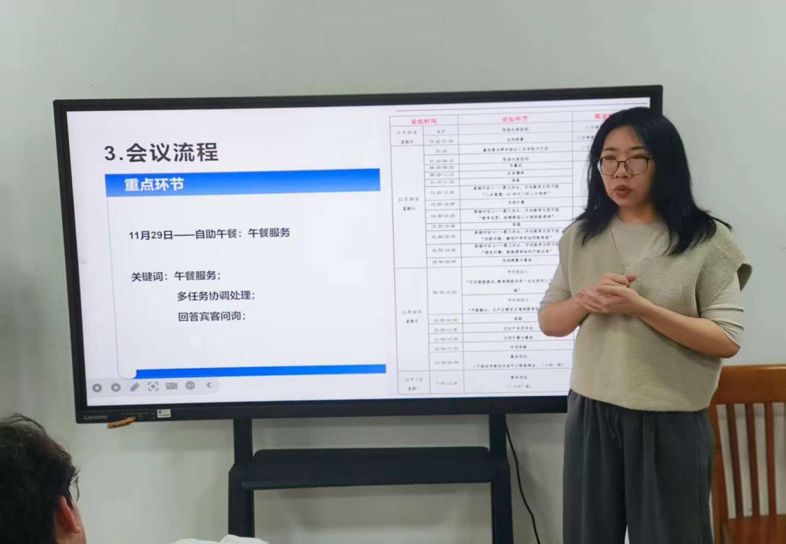 在筹备阶段,杨欣达老师将课程教学与论坛需求深度绑定,面向酒店管理专业学生召开了“志愿者培训暨课程项目制教学实践启动会”。他没有照本宣科,而是围绕论坛“聚力共生”的主题,对学生进行了高强度的实战特训。