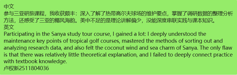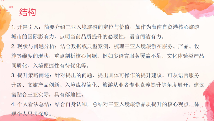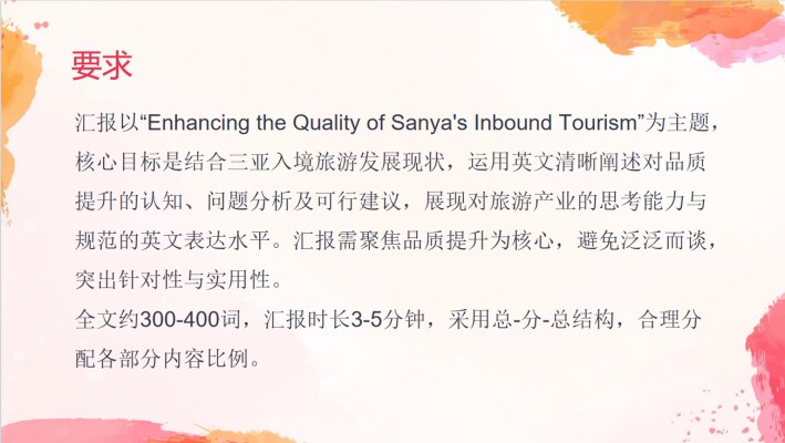 在董佳音老师的指导下,课程以一项明确的英文汇报任务作为高潮。围绕“提升三亚入境旅游品质”这一主题,同学们将所学所感,系统梳理成结构清晰、建议具体的英文报告与演讲,实现了从输入到输出的完整闭环。“我学会了如何撰写一份面向外国游客的问卷,并完成了一篇建议稿。”一位同学自豪地分享道。