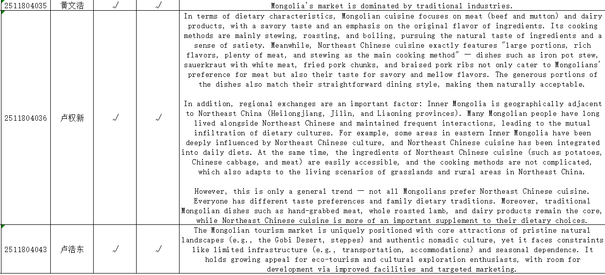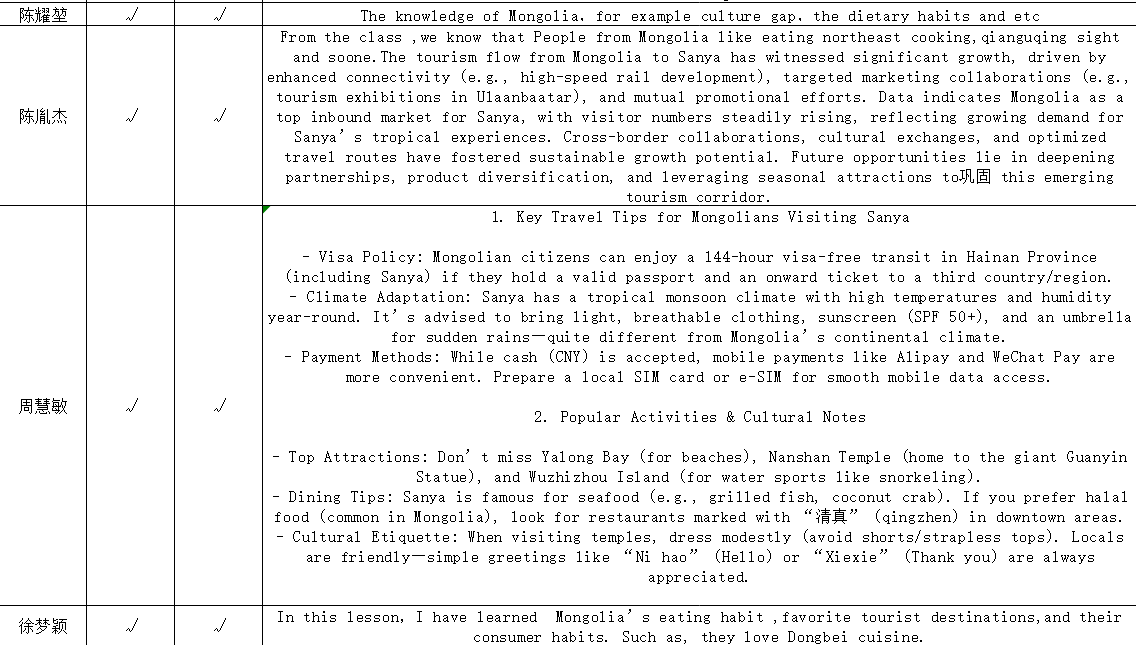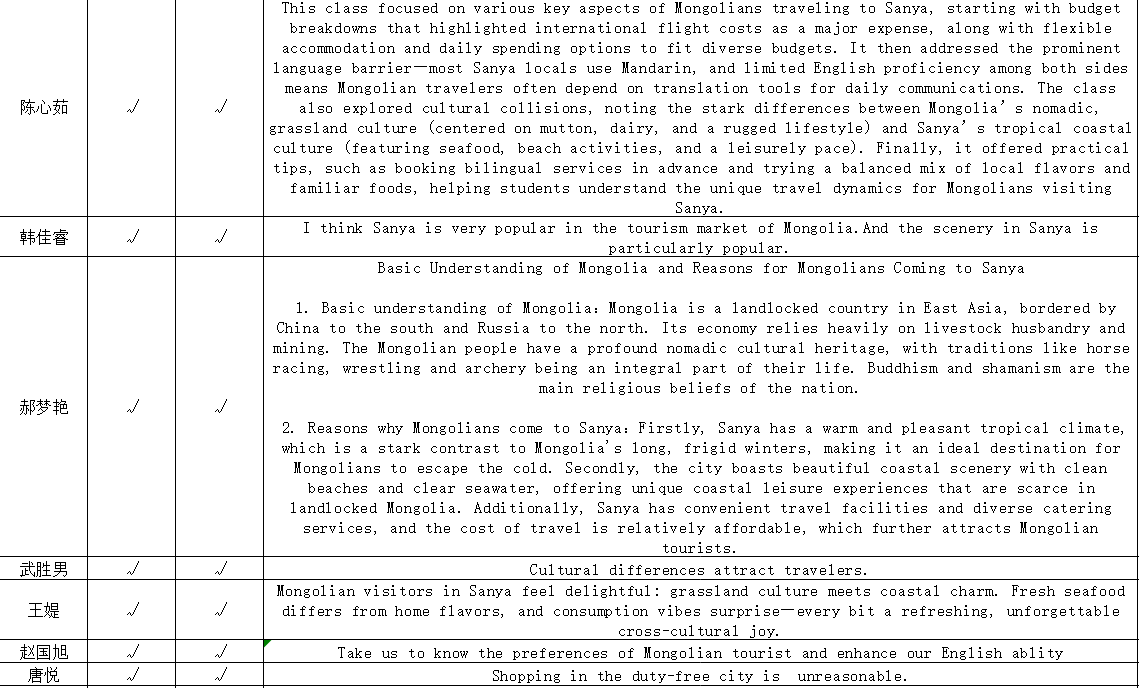 Afterward, Miss Meng Zhu guided everyone through cultural differences, exploring Chinese and foreign etiquette and how tourism can boost rural revitalization. Mr. Xin Mingtao then led students to focus on "Tourism Culture and Cultural Tourism". Miss Zhang Zhilei inspired the design of more in-depth research directions. Through thematic discussions on specific source markets (such as tourists from Mongolia), students gained a deep understanding of how cultural preferences shape tourism consumption behaviors. "I not only learned vocabulary but also gained insights into foreign cultures and cuisine, and mastered how to conduct research in English!" summarized Zhao Guoxu.