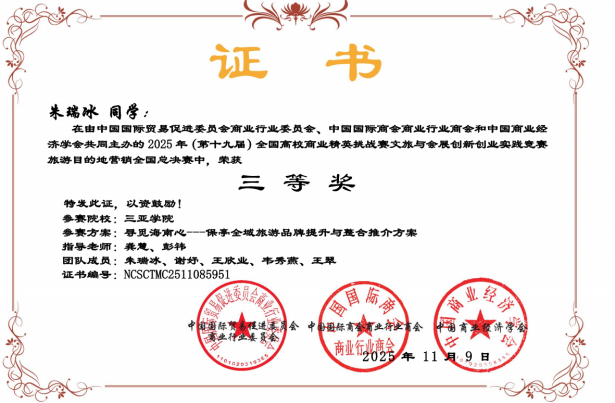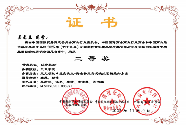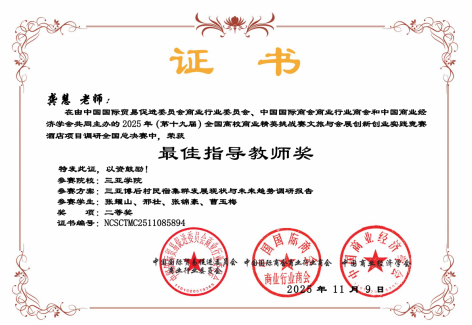 本次竞赛中,专业师生依托课程教学与科研项目,实现“以赛促学、以赛促教”的深度融合。龚慧老师指导的团队将《旅游消费者行为》课程成果与赛事要求紧密结合,围绕乡村旅游目的地营销展开实践,精准对接国家乡村振兴战略与海南“泛三亚圈”发展政策,体现了“课程—竞赛—产业”的贯通式培养思路。团队通过实地调研、数据分析、数字化营销方案设计等环节,系统锻炼了学生解决实际问题的综合能力,尤其在AIGC技术应用于文旅场景方面进行了有益探索,展现了前瞻性的教学视野。