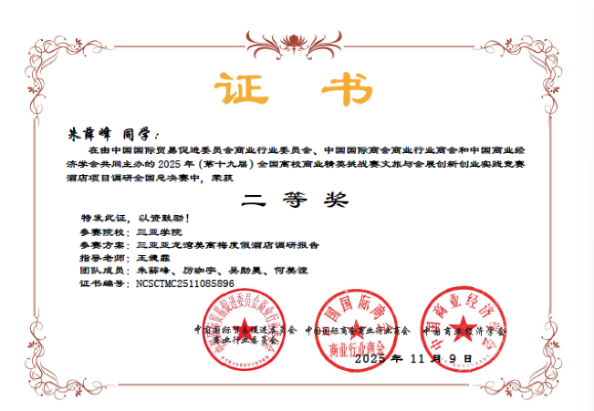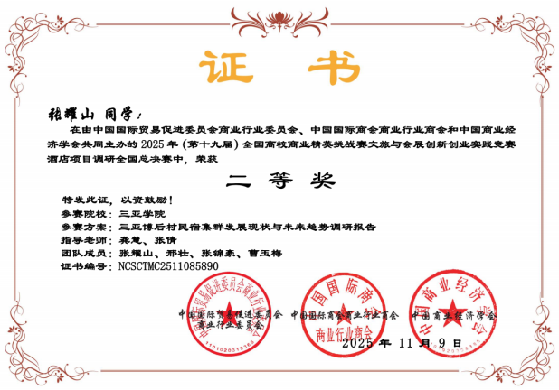 近日,第十九届全国高校商业精英挑战赛文旅与会展创新创业实践竞赛全国总决赛圆满落幕。旅酒学院酒店管理专业师生团队在比赛中表现卓越,共斩获全国二等奖四项、三等奖三项,多名指导教师荣获“最佳指导教师奖”,充分彰显了专业扎实的教学实力与创新育人成果。