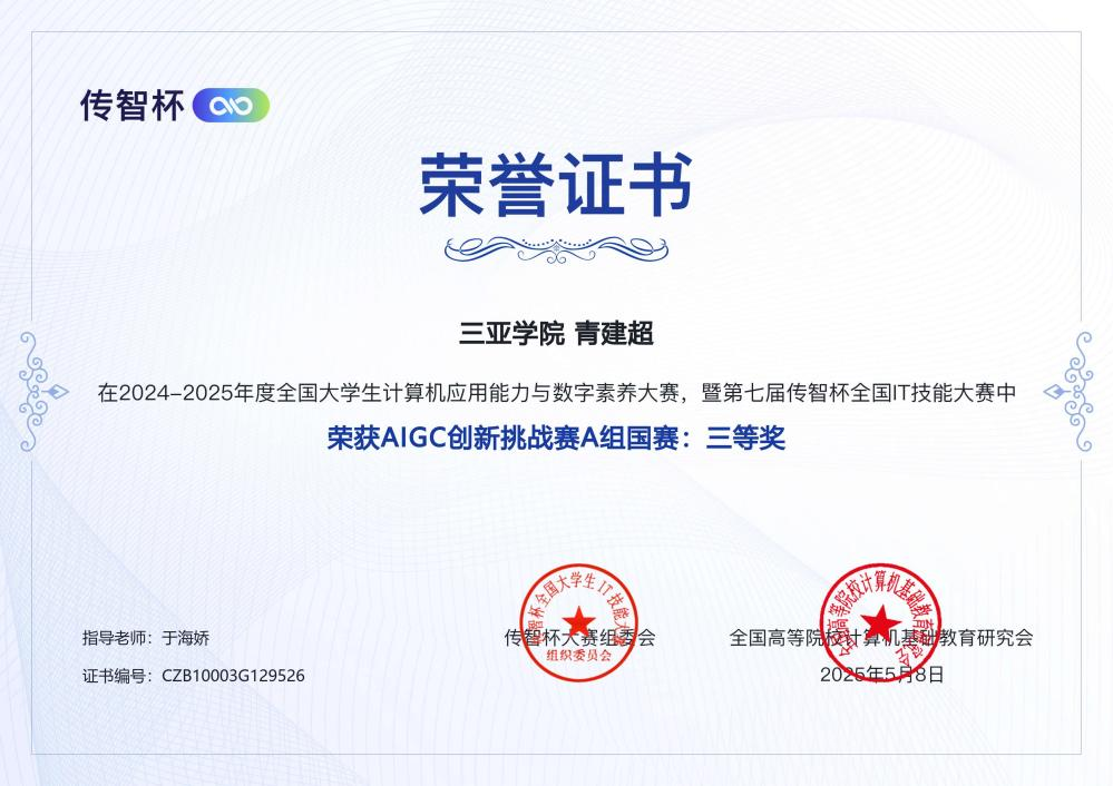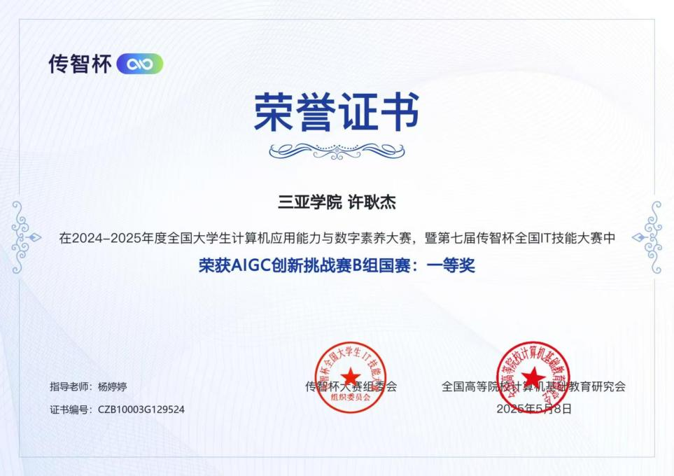 2024-2025年度全国大学生计算机应用能力与数字素养大赛暨第七届传智杯全国IT技能大赛圆满收官。本届赛事吸引了全国50多所高校、500多名选手同台竞技,经过多轮激烈比拼,虚拟2301班学生许耿杰凭借《山行》项目,从众多参赛者中脱颖而出,斩获国赛一等奖!虚拟2301班青建超同学作品《千里莺啼绿映红,水村山郭酒旗风》斩获国赛三等奖!这是我校在人工智能与生成式内容(AIGC)领域人才培养的又一成果突破。