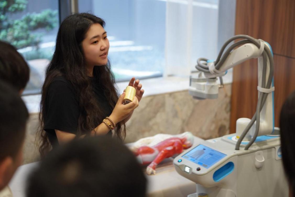 大医匠科技海南公司办公室主任、MTA2024级研究生荆芝霏为学弟学妹们进行了一场生动的“产品工作坊”式教学。她现场引导同学们观察并体验了中医四诊仪、艾灸机器人等智能康养设备。在讲解中医四诊仪时,她不仅演示了设备如何通过面诊、舌诊、脉诊、问诊采集数据,并借助人工智能算法进行体质辨识与健康分析,更启发同学们思考:如何将这一系列看似专业的医疗检测流程,转化为游客可感知、可参与、甚至有收获的互动体验环节?如何将生成的健康报告转化为后续个性化康养服务或旅游产品推荐的起点?在介绍艾灸机器人时,她则从解决传统艾灸服务标准化难度大、专业技师资源有限的产业痛点出发,阐释了技术如何赋能服务规模化与品质稳定性。