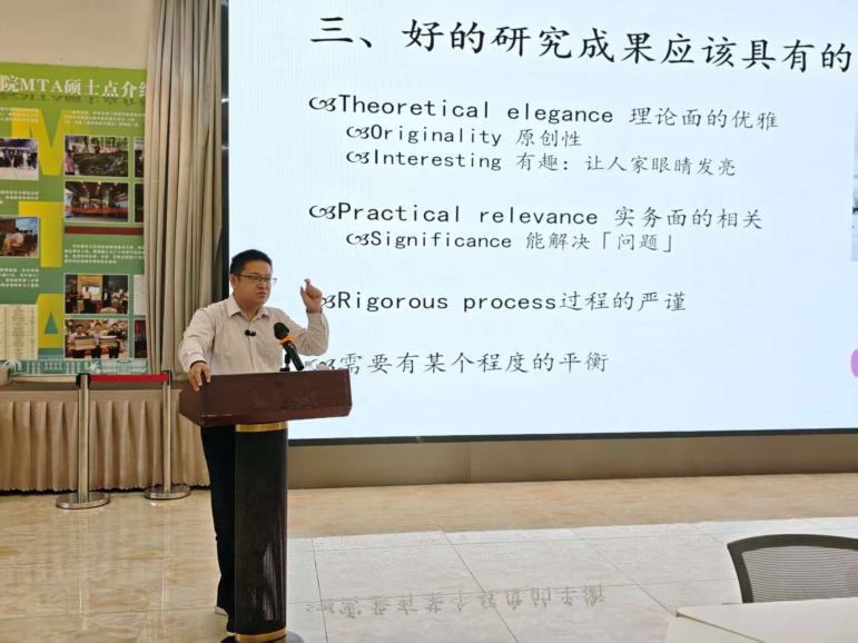 李玺教授围绕 “优质研究成果的核心特质” 展开深度分享。他指出,好的研究成果需兼具六大特点:一是理论面的优雅,以严谨的理论框架支撑研究逻辑;二是原创性,精准捕捉学术空白形成独特贡献;三是有趣性,让研究内容具备 “让人眼睛发亮” 的吸引力;四是实务面的相关,紧密贴合产业实际需求;五是解决问题的意义,通过研究回应真实行业痛点;六是过程的严谨,从方法选择到数据论证都需规范落地 —— 而优质成果的关键,正在于实现这六大特质的平衡。