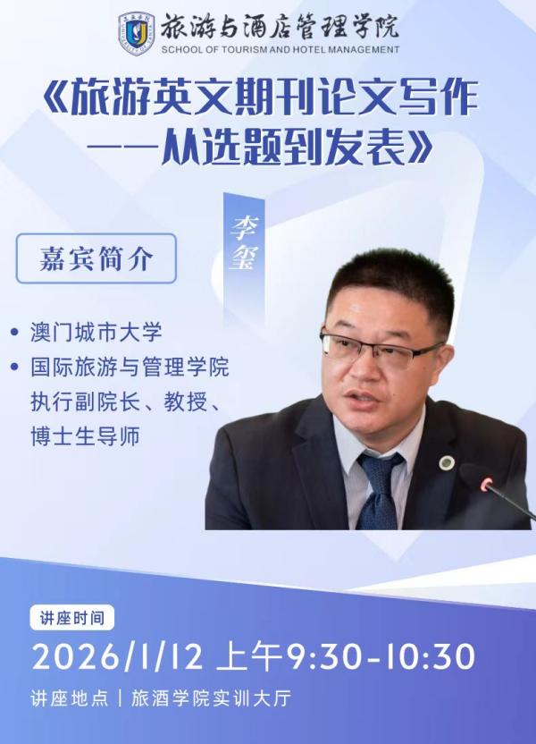 为提升MTA(旅游管理硕士)研究生的学术研究能力与国际成果输出水平,助力学子打通“从科研到发表”的关键链路,在三亚学院MTA产教融合周期间,澳门科技大学国际酒店与旅游管理学院李玺教授受邀带来“旅游英文期刊论文写作——从选题到发表”专题分享。