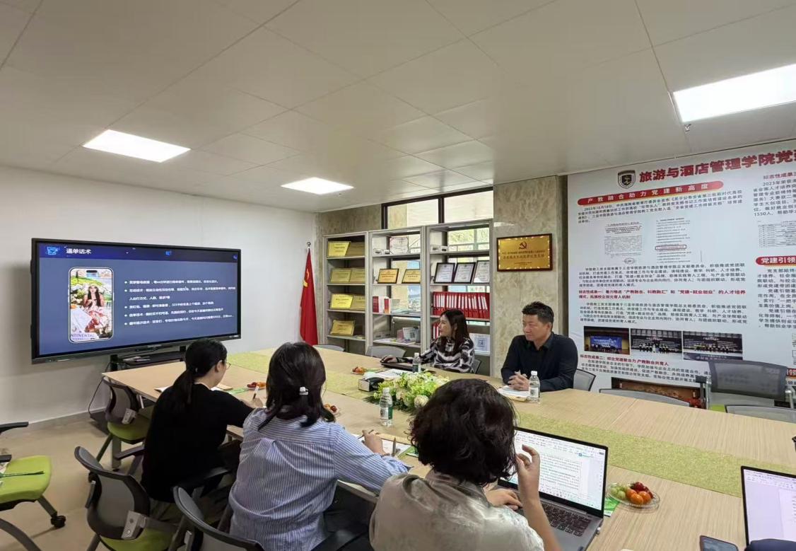 陈卡雷、鄂松美两位总经理分别介绍了企业在酒旅行业规划咨询、新媒体运营领域的资源优势与实践经验,重点分享了企业成熟的 MCN 机构培训框架体系,该体系涵盖矩阵起号、直播运营、短视频创作、盈利模式打造、达人孵化等全流程实操内容,形成了从新手入门到进阶提升的完整培训课程体系。他们表示,旅酒学院在旅游专业人才培养方面具备深厚积淀,希望将企业的实战型培训课程嵌入学院课堂教学,以《旅游新媒体营销与运营》《旅游新媒体目的地营销》《旅游网络营销》等核心课程为抓手,把行业一线的运营技巧、实战案例、岗位要求融入教学环节,让学生在校即可掌握酒旅新媒体运营的实用技能。