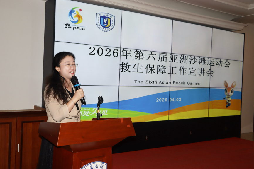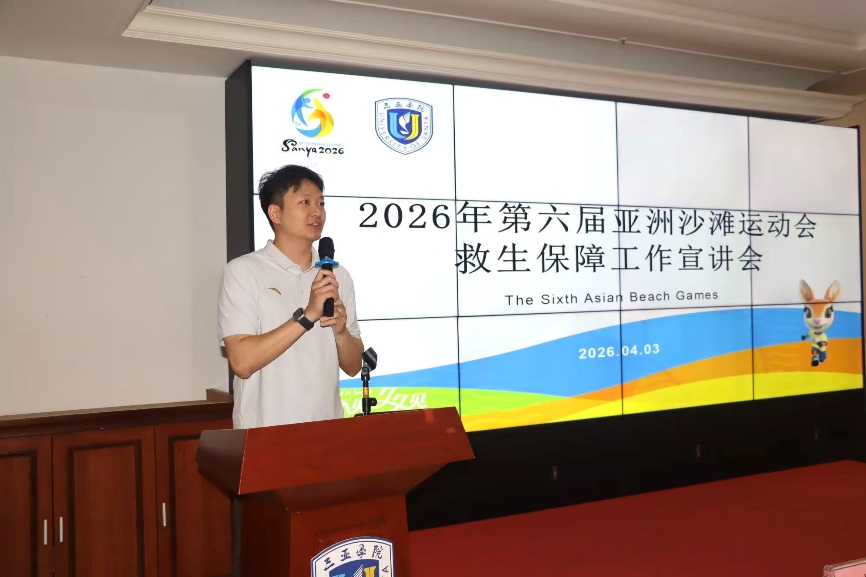 4月3日上午,2026年第六届亚洲沙滩运动会救生保障工作宣讲会在三亚学院书山馆报告厅西厅顺利举行。本次会议以“筑牢水上赛事安全防线,护航亚沙盛会圆满举办”为主题,全面部署亚沙会救生保障任务,明确工作标准与要求,强化队伍责任担当。国家体育总局游泳运动管理中心副部长、第六届亚洲沙滩运动会公开水域游泳项目竞赛主任施博、三亚学院旅游与大健康学院院长李慧、党总支副书记安娜、体育系主任李晓媛、三亚市游泳协会会长、亚沙会公开水域游泳项目竞赛助理芦燕出席,学院救生保障服务团队全体师生参加会议。